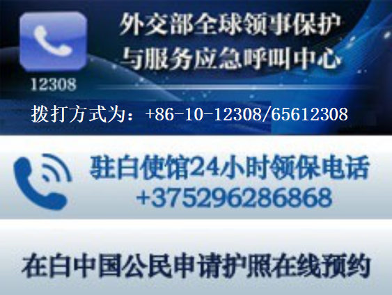 1、我館領事僑務處對外辦公時間:每周一、三、五(節假日除外)09:00-11:30;電話:+375-17-3117555(中文)、+375-17-3117547(俄文),接聽時間:每周一、三、五(節假日除外)明斯克時間14:30-18:00(北京時間19:30-23:00);領保電話:+375-29-6286868;郵箱: